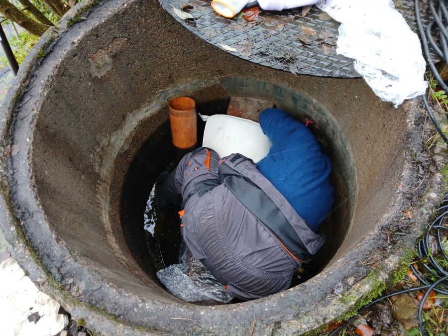 Das große Regenrückhaltebecken hinter der Ceremoni staut das Wasser nicht mehr auf! Hier versucht sich unsere Tochter Sarah gerade an dem sogenannten Mönch im Überlaufschacht - leider vergebens. Wir werden wohl ohne eine Fachfirma das Problem nicht beseitigen können!