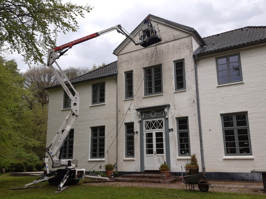 Nachdem der Dreck und auch die (Farb-)Spuren aus der Zeit der Fenstererneuerung 2013 - 2014 mit einem Hochdruckreiniger beseitigt, kleinere Ausbesserungsarbeiten an den Dachunterständen und Fensterlaibungen erledigt und auch die Dachpfannen von dem gröbsten Moosbelag gereinigt worden waren, standen die nächsten aufwändigen Vorarbeiten an: Das Abkleben der Fenster, Regenfallrohre und Abdecken der Terrassen sowie der Wege.